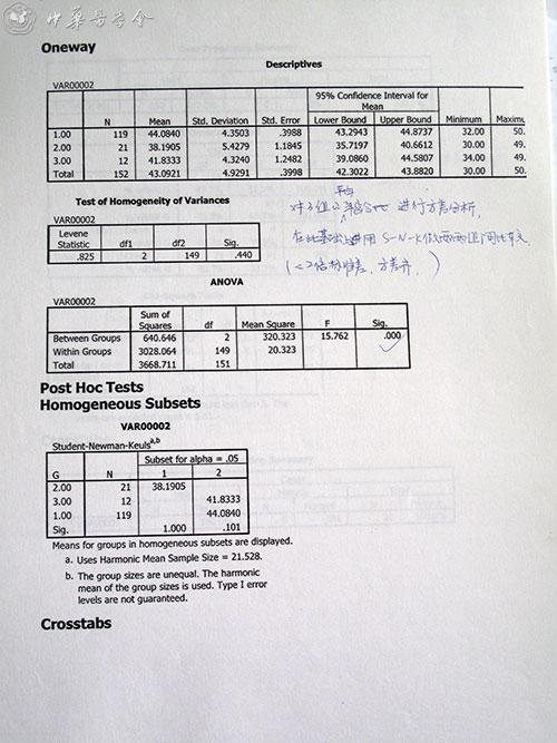 比如下面这张图,就是对3组的计量资料应用方差分析进行总体比较,继而应用SNK检验进行两两比较的统计学结果。
