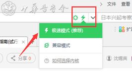 具体方法是查看360浏览器网址输入框的右侧,点击 “e”图片,出现下拉框,点击绿色小闪电符号,即可从兼容模式转为极速模式: